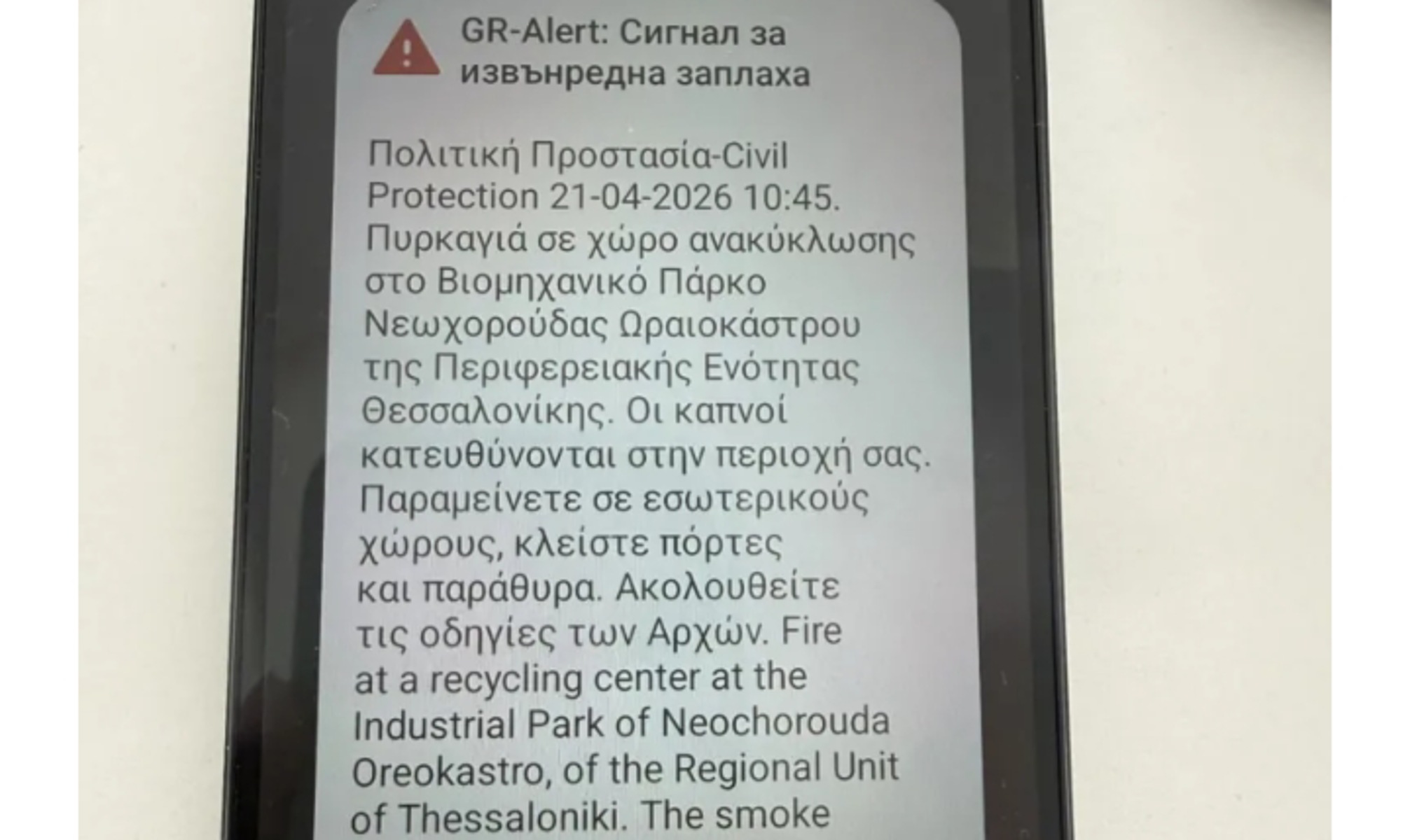 Το μήνυμα του 112, αναφέρει τα εξής: “Πυρκαγιά σε χώρο ανακύκλωσης στο Βιομηχανικό Πάρκο Νεοχωρούδας Ωραιοκάστρου της ΠΕ Θεσσαλονίκης. Οι καπνοί κατευθύνονται στην περιοχή σας. Μείνετε σε εσωτερικούς χώρους. Κλείστε πόρτες και παράθυρα”.