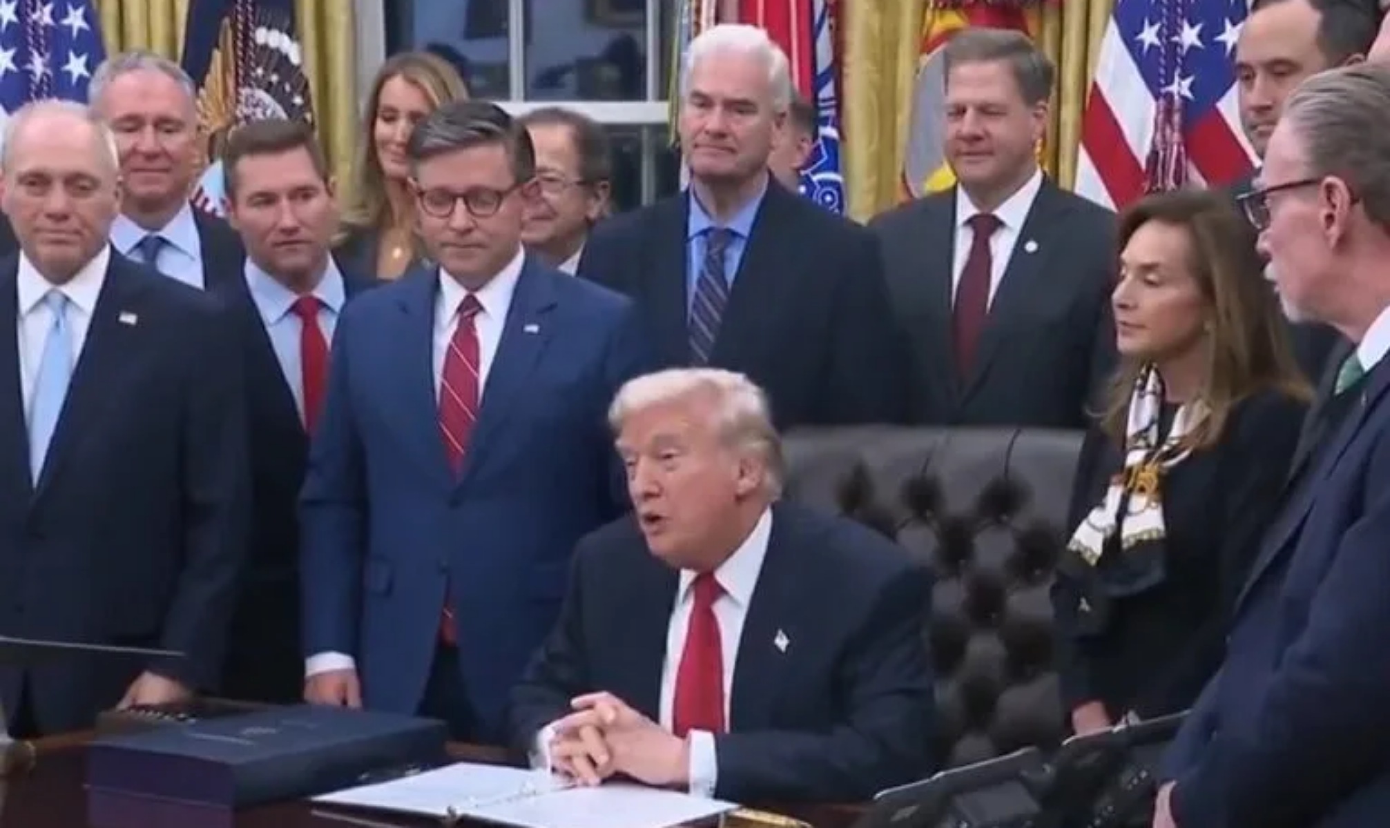 .Τις τελευταίες 43 ημέρες, οι Δημοκρατικοί στο Κογκρέσο έκλεισαν την κυβέρνηση των Ηνωμένων Πολιτειών σε μια προσπάθεια να εκβιάσουν τους Αμερικανούς φορολογούμενους για εκατοντάδες δισεκατομμύρια δολάρια για παράνομους μετανάστες… Σήμερα, στέλνουμε ένα σαφές μήνυμα ότι ΔΕΝ θα ενδώσουμε ΠΟΤΕ σε εκβιασμούς», δήλωσε ο Τραμπ κατά την υπογραφή του νομοσχεδίου.