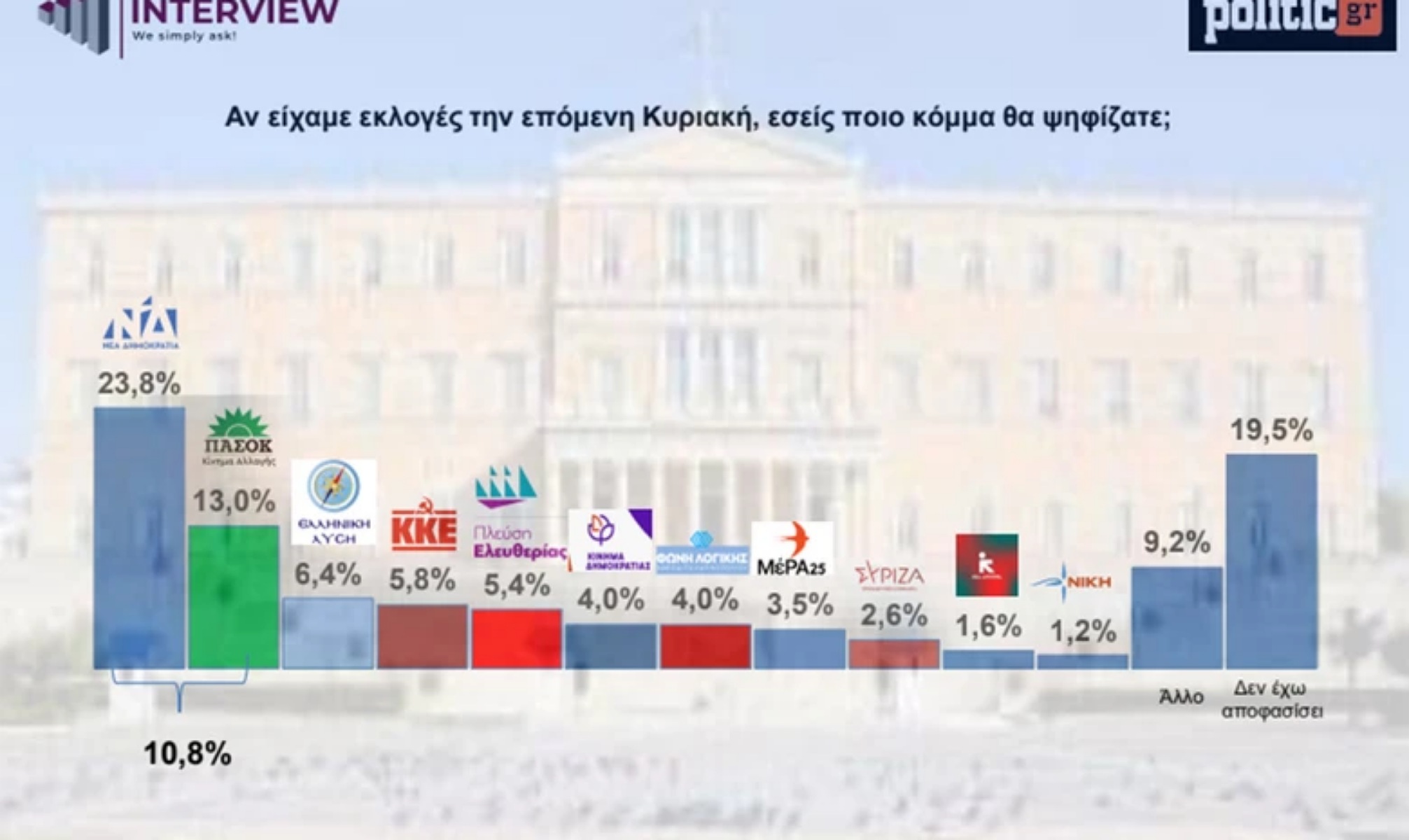 Σύμφωνα με τη νέα έρευνα της Interview για την POLITIC, συγκρίνοντας τα αποτελέσματα με τη μέτρηση του Σεπτεμβρίου, η Νέα Δημοκρατία παραμένει σταθερή στο 23,8% (από 23,9%), το ΠΑΣΟΚ – Κίνημα Αλλαγής στη δεύτερη θέση με 13% (από 13,2%), ενώ η Ελληνική Λύση υποχωρεί στο 6,4% (από 7,5%). Το ΚΚΕ σημειώνει μικρή πτώση στο 5,8% (από 6,1%), ενώ η Πλεύση Ελευθερίας καταγράφει σημαντική μείωση στο 5,4% (από 6,4%), υποδηλώνοντας απώλεια δυναμικής μετά την καλοκαιρινή άνοδο της.