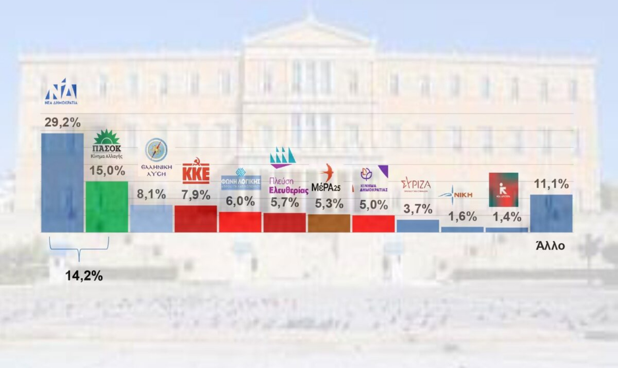 Στην εκτίμηση εκλογικού αποτελέσματος, η ΝΔ εξασφαλίζει ποσοστό 29,2%, το ΠΑΣΟΚ 15%, η Ελληνική Λύση 8,1%, το ΚΚΕ 7,9%, η Φωνή Λογικής 6%,η Πλεύση Ελευθερίας 5,7%, το ΜέΡΑ25 5,3%, το Κίνημα Δημοκρατίας 5%, ο ΣΥΡΙΖΑ 3,7%, η Νίκη 1,6%, η Νέα Αριστερά 1,4% και άλλο το 11,1%.