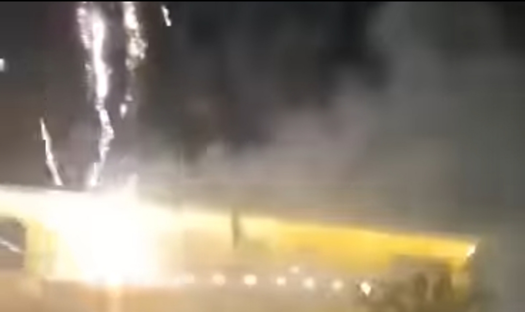 Η παρατεταμένη ρίψη πυροτεχνημάτων πραγματοποιήθηκε χωρίς κανένα μέτρο ασφάλειας και, όπως φαίνεται στο υλικό, προς το τέλος της εκδήλωσης κάτι δεν πήγε καλά: τα πυροτεχνήματα που είχαν τοποθετηθεί μπροστά από το κτίριο της Εθνικής Τράπεζας έσκασαν πάνω από τα κεφάλια του κόσμου.