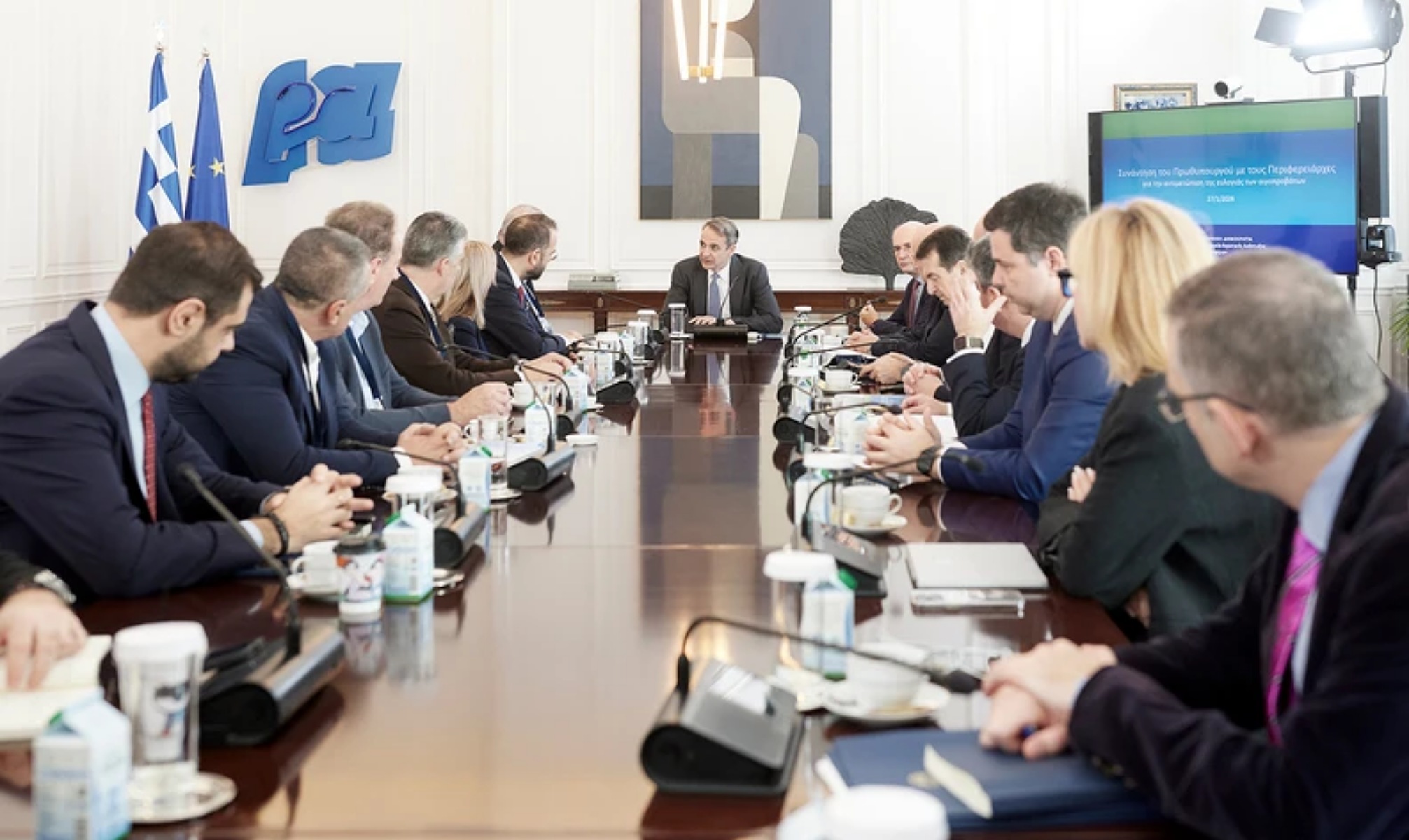 Στη σύσκεψη συμμετείχαν ο αντιπρόεδρος της κυβέρνησης, Κωστής Χατζηδάκης, ο υπουργός Προστασίας του Πολίτη, Μιχάλης Χρυσοχοΐδης, ο υπουργός Αγροτικής Ανάπτυξης και Τροφίμων, Κώστας Τσιάρας, ο υφυπουργός παρά τω πρωθυπουργώ, Θανάσης Κοντογεώργης, ο υφυπουργός παρά τω πρωθυπουργώ και κυβερνητικός εκπρόσωπος, Παύλος Μαρινάκης, ο υφυπουργός παρά τω πρωθυπουργώ, Γιώργος Μυλωνάκης, η περιφερειάρχης Κεντρικής Μακεδονίας, Αθηνά Αθανασιάδου-Αηδονά, ο περιφερειάρχης Δυτικής Ελλάδας, Νεκτάριος Φαρμάκης, ο περιφερειάρχης Ανατολικής Μακεδονίας και Θράκης, Χριστόδουλος Τοψίδης, ο περιφερειάρχης Θεσσαλίας, Δημήτρης Κουρέτας, καθώς και ο περιφερειάρχης Ηπείρου, Αλέξανδρος Καχριμάνης, στην περιοχή του οποίου η ζωονόσος έχει αντιμετωπιστεί και εκλήθη στη σύσκεψη, προκειμένου να ενημερώσει σχετικά με το πώς αντιμετώπισε το πρόβλημα.